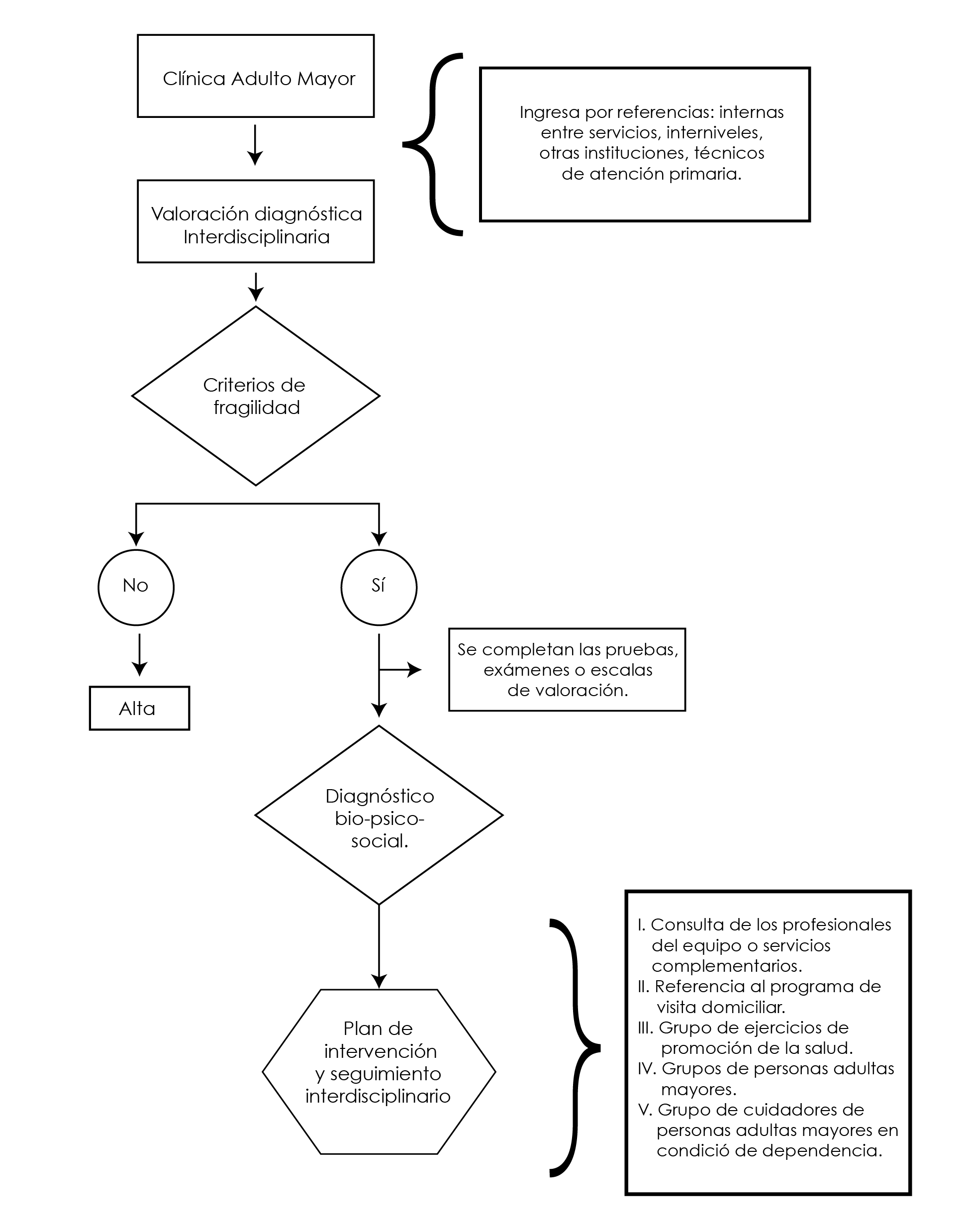 Durante el proceso, la valoración tenía como objetivo identificar criterios asociados al síndrome de fragilidad en la persona adulta mayor; o evidenciar un proceso de envejecimiento exitoso o activo. En el último caso, el equipo interdisciplinario reforzaba las conductas saludables y remitía a persona a la consulta de atención primaria.