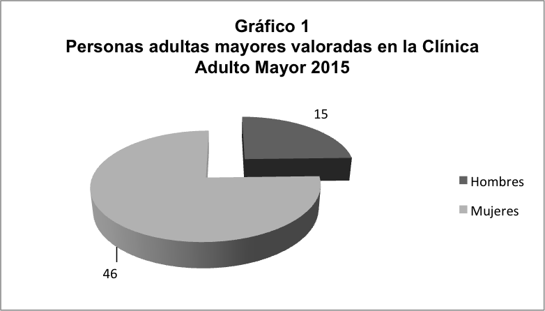 Para atender la consulta interdisciplinaria en la Clínica Adulto Mayor durante el periodo comprendido entre febrero y noviembre del 2015, el equipo técnico realizó 25 sesiones de trabajo e hizo un total de 61 valoraciones integrales. La mayoría de las personas atendidas fueron mujeres, situación que históricamente ha sido significativa en la cultura costarricense, si se considera que la población femenina es la que se adscribe con mayor frecuencia a los centros de salud.
