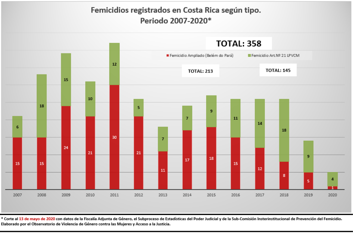 En Costa Rica, uno de los tipos de violencia que más llama la atención es la violencia ejercida hacia las mujeres; según datos del “Observatorio de violencia de género contra las mujeres y acceso a la justicia”, en Costa Rica, del 2007, año en que se promulgó la Ley de Penalización de la Violencia contra las Mujeres (LPVcM), al 13 de mayo del 2020 hubo un total de 358 feminicidios. En la grafica siguiente se muestran los datos desagregados: aquellos casos que se configuran como femicidio de acuerdo con la ley citada y los que están fuera del carácter estricto de la ley penal, pero que se consideran feminicidios, según los acuerdos tomados en Belém do Para